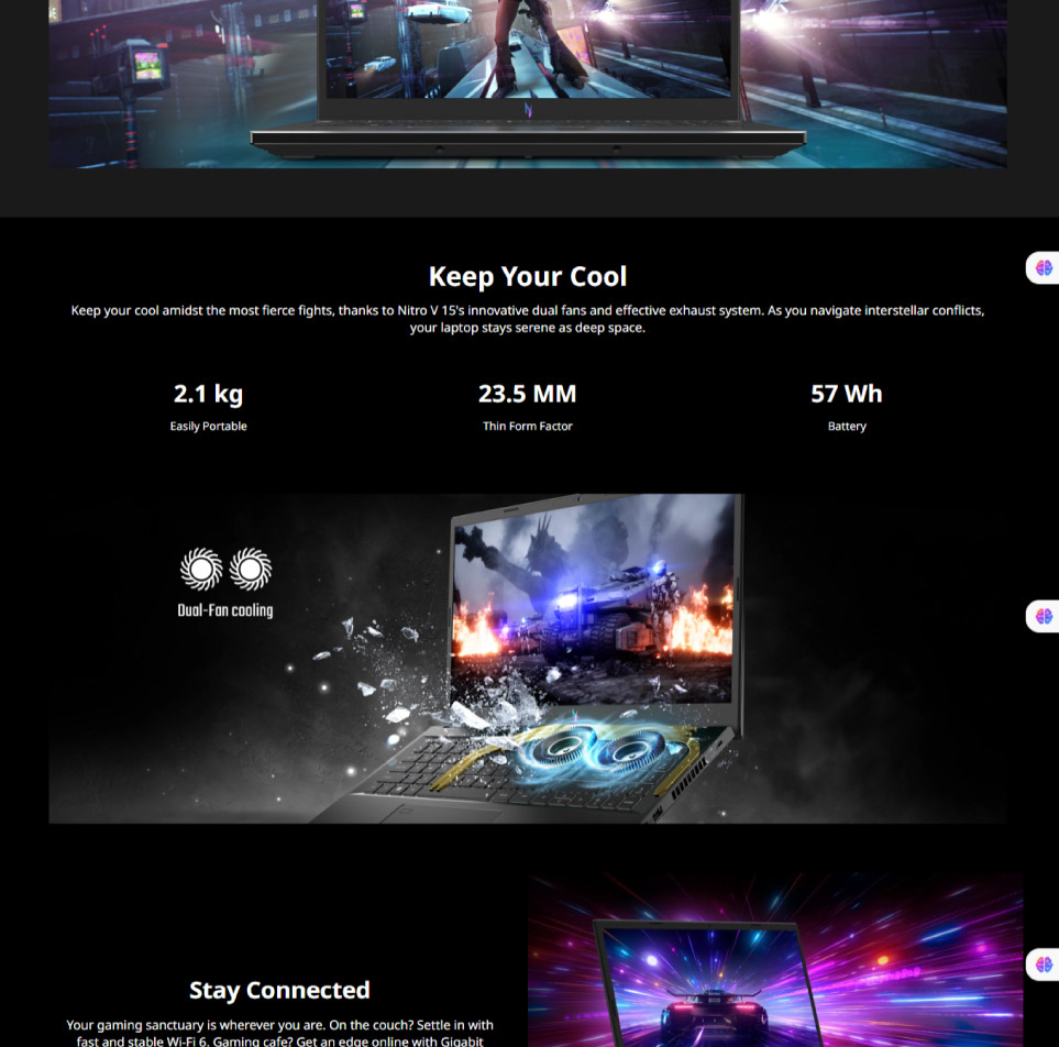 - 15.6″ display with IPS (In-Plane Switching) technology, Full HD 1920 x 1080, high-brightness (300 nits) Acer ComfyView™ LED-backlit TFT LCD, supporting 165 Hz, 3 ms Overdrive, 16:9 aspect ratio, sRGB 100% Wide viewing angle up to 170 degrees Ultra-slim