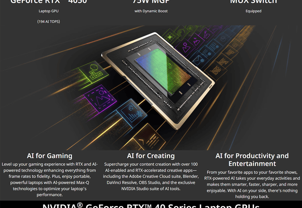 - NVIDIA® GeForce RTX™ 4050 with 6 GB of dedicated GDDR6 VRAM