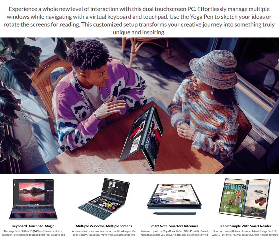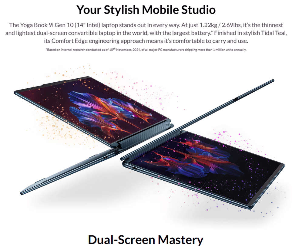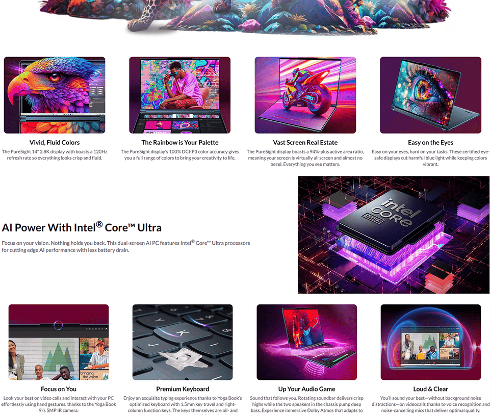 - 2x 14″ 2.8K WQXGA+ (2880×1800) OLED 750nits (peak) / 500nits (typical) Glossy / Anti-fingerprint, 100% DCI-P3, 120Hz, Eyesafe®, Dolby Vision®, DisplayHDR™ True Black 600, Glass, Touch, PureSight