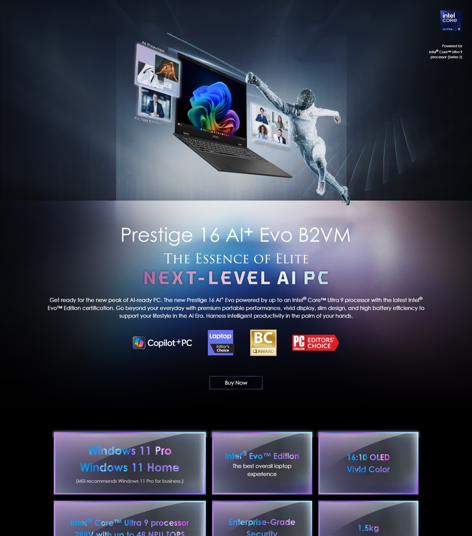 MSI Prestige 16 AI+ Evo B2VMG-026 16” UHD+ OLED Laptop ( Ultra 7 258V, 32GB, 1TB SSD, Intel Arc, W11, H&S )